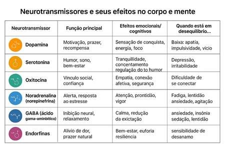 Na tabela abaixo poderemos observar alguns exemplos de Neurotransmissores e seus efeitos no corpo e na mente. Logo após, proponho algumas ações simples que podem ajudar na regulação desses neurotransmissores.
